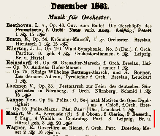 一个熟悉而合理的解释,可能要追溯到德沃夏克的第一位传记作者Otakar Šourek的说法,那就是在作曲家逗留维也纳期间的一场音乐会上,他听到了莫扎特的所谓《大帕蒂塔》(Gran Partita,K.361,有十二个管乐器和低音提琴),暗示这个听觉印象启发了他自己的小夜曲。