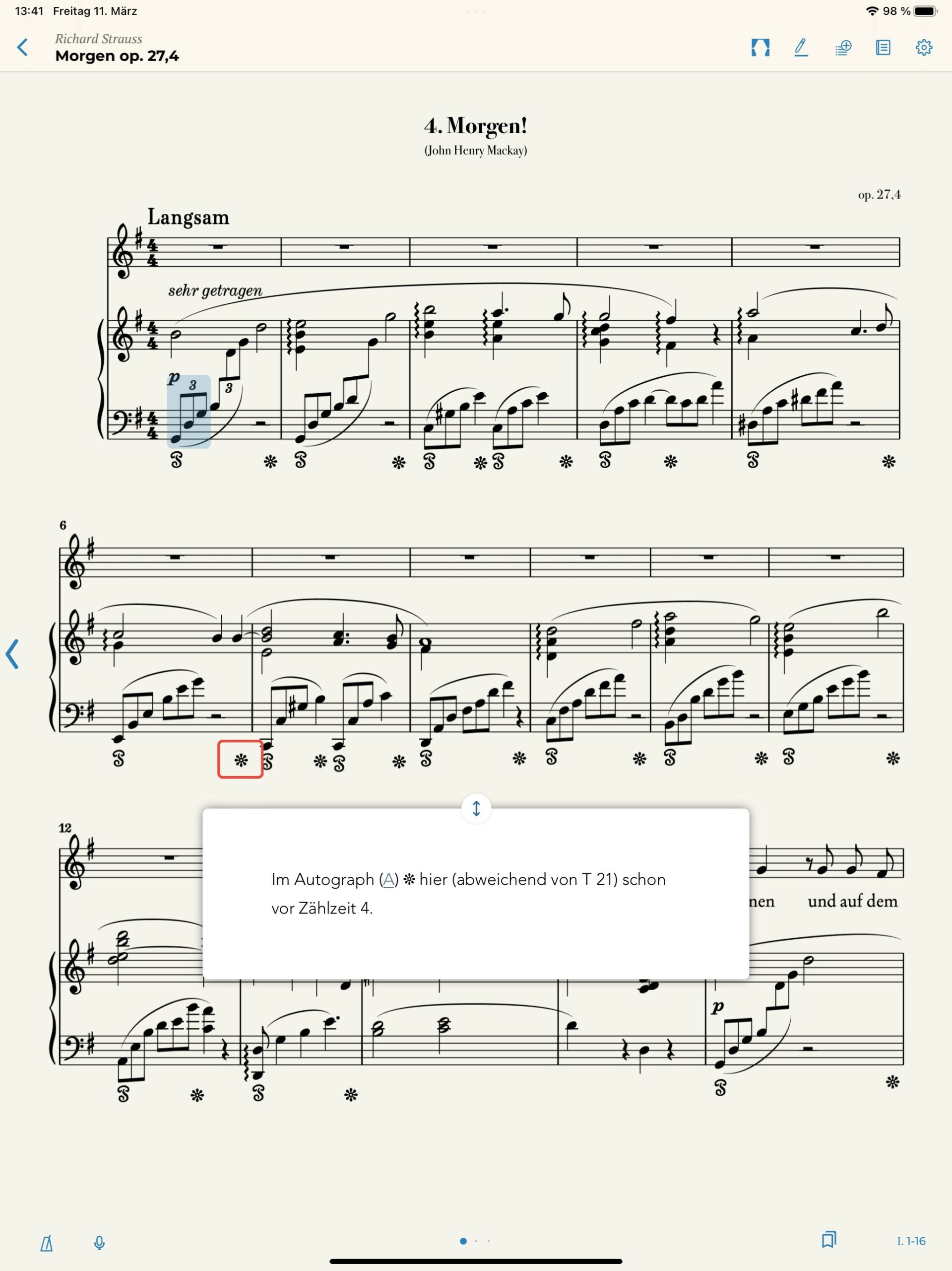 但是,在这个精心设计的工作流程中,得到加强的不仅仅是我们的音乐文本。序言和评论也同样重要,它们是每个原作版的重要组成部分,在每个数字版出版之前,它们都被注入了新的活力。激活“音乐文本中的注释”按钮。现在,你不必再翻开书页,直到到达印刷版的末尾,然后在注释中寻找正确的小节——相反,可以在音乐中的正确位置访问注释。这个位置用彩色标出,用手指轻轻一点就可以打开注释。而且,你不必寻找来源的缩写列表——只要点击来源的缩写,谜底就会在一个单独的弹出窗口中被解开。这是PDF文档中“冻结”的文本所不能提供的……
