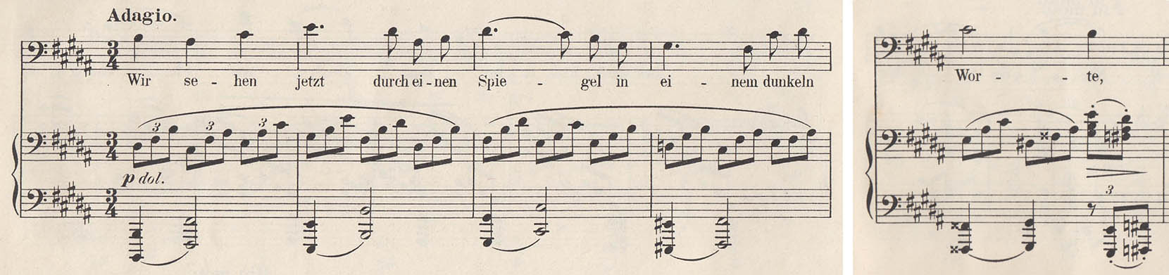 在最后一首歌的结尾部分,即勃拉姆斯对伟大的《爱之歌》(哥林多前书13章)最后一句话的深情设定中,会遇到一个令人烦恼的模糊的音乐符号。在第83至87节(图1),有三个音乐层次重叠在一起。首先是声乐部分的四分音符和普通(双音)八分音符;其次是钢琴部分的两个低声部,其分解和弦以八分音符的三连音运行;第三是钢琴部分向上的高声部,一方面记为双音(与声乐部分一样,节奏上与之一致),另一方面(从音头的垂直方位和重合),被纳入中间钢琴部分的三连音运动。