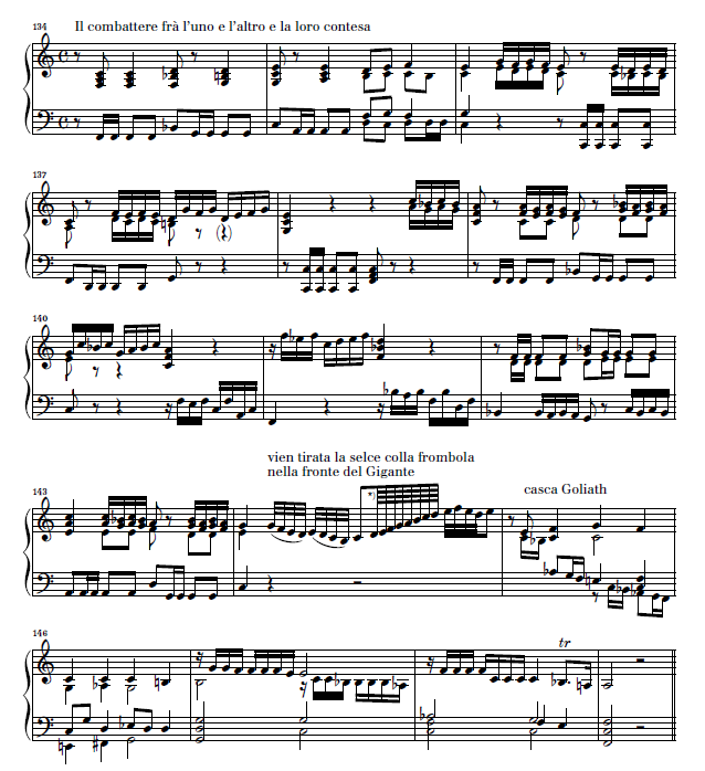 最受欢迎的当然是通常被称为“圣经奏鸣曲”的作品,因为它们是受标题启发的巴洛克音乐的特别好的例子。在这六首奏鸣曲中,库瑙从《旧约》中选取了一个圣经主题,并对各种场景进行了音调描绘(借助于标题阐明了音乐文本中的相关事件)。例如,这里是第一首奏鸣曲中的一页,主题是“大卫对抗歌利亚”。库瑙非常生动地描绘了大卫投掷石头和歌利亚倒下的场景。