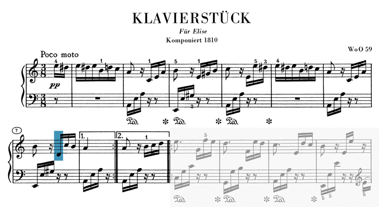 Der Ton e¹ hingegen findet sich in dem lange nach Beethovens Tod veröffentlichten Erstdruck des Stückes durch den Beethovenforscher Ludwig Nohl. Dieser hatte das Autograph der bislang unbekannten Komposition entdeckt und sie 1867 als Klavierstück „Für Elise“ veröffentlicht.