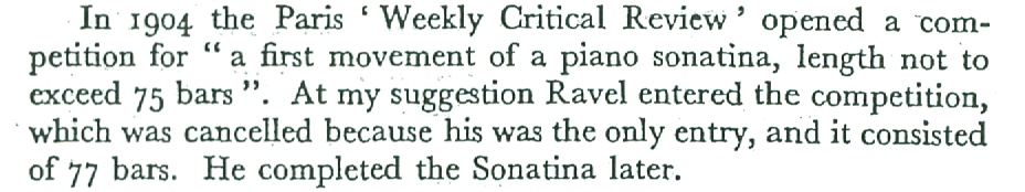 Ravel nahm demnach 1904 auf Calvocoressis Vorschlag hin an einem Kompositionswettbewerb für den ersten Satz einer Klaviersonatine in der Zeitschrift Weekly Critical Review teil. Dieser Wettbewerb sei aber abgesagt worden, weil Ravel der einzige Teilnehmer geblieben sei und überdies mit 77 Takten die Vorgabe von 75 Takten überschritten habe.