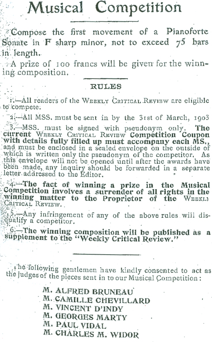 Vergleicht man den Text mit Calvocoressis Angaben, ergeben sich einige interessante Abweichungen. Der Wettbewerb wurde 1903 (nicht 1904) ausgeschrieben, erbeten wurde der erste Satz einer Klaviersonate (nicht einer Sonatine), zudem mit der Vorgabe der Tonart fis-moll. Außerdem verschwieg Calvocoressi, dass den Gewinner die Preissumme von 100 Francs (nach heutigem Geldwert ca. 350 €) und die Publikation seines Manuskripts in einer Beilage der Weekly Critical Review erwarteten.