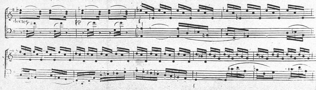Wir sind in der Durchführung des 1. Satzes. Sehen Sie, von welcher rätselhaften Note ich spreche? Vielleicht haben Sie die Sonate schon einmal selbst gespielt? Dann würden Sie höchstwahrscheinlich über die 1. Note des2 in der rechten Hand im 10. Takt unseres Beispiels stolpern. Die meisten, wenn nicht alle modernen Ausgaben drucken stattdessen d2 und weichen damit von der einzigen Quelle zu diesem Werk ab. Gründe dafür gibt es wohl im Wesentlichen drei: