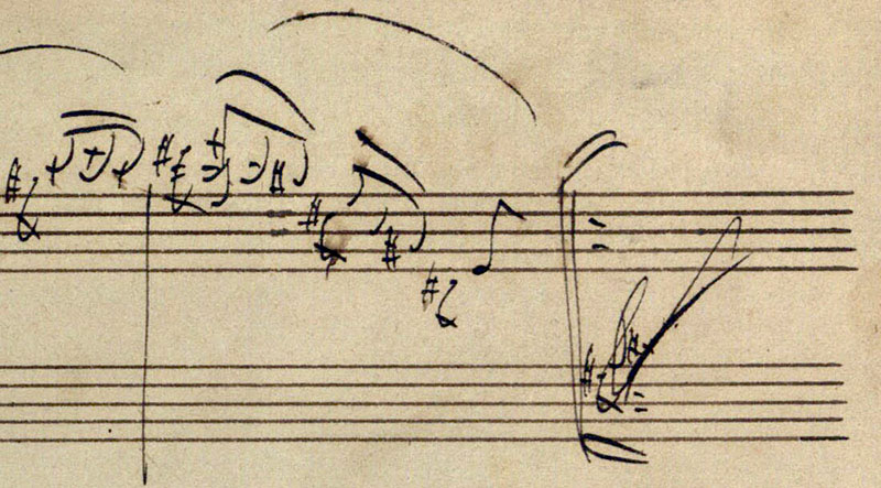 Diese Vermutung ist sehr naheliegend, doch die Quellen kommen uns in dieser Frage leider gar nicht entgegen. Als Hauptquelle unserer Edition dient Brahms’ Handexemplar der Erstausgabe mit autographen Korrekturen und Einträgen, dazu kommt die von Brahms gründlich korrigierte Stichvorlage, und seit einiger Zeit steht sogar wieder das Autograph zur Verfügung, das lange Zeit als verschollen galt, aber heute in der Russischen Nationalbibliothek St. Petersburg konsultierbar ist. Die Quellenlage ist also sehr gut und inhaltlich belastbar, und das Ergebnis einhellig: nirgendwo steht in dieser Variation nach dem 4.Takt ein Wiederholungszeichen. Im digitalen Archiv des Brahms-Instituts Lübeck kann die entsprechende Seite der Erstausgabe betrachtet werden. Die folgende Abbildung zeigt die Stelle im Autograph, wo Brahms die Wiederholungsklammer sogar explizit nur nach rechts zum 2. Teil hin öffnet (die gestrichenen Noten gehören schon zu T.5, den Brahms aus Platzgründen hier abbricht und in der nächsten Zeile neu beginnt):