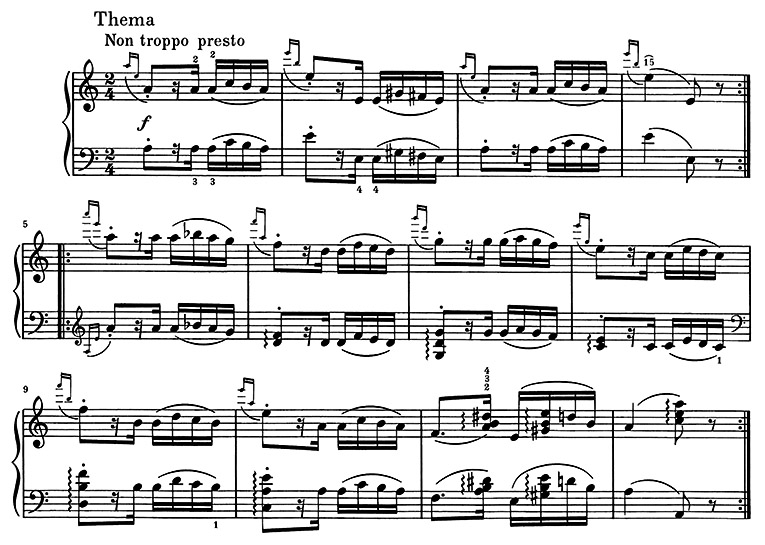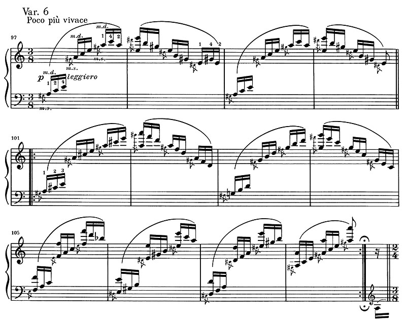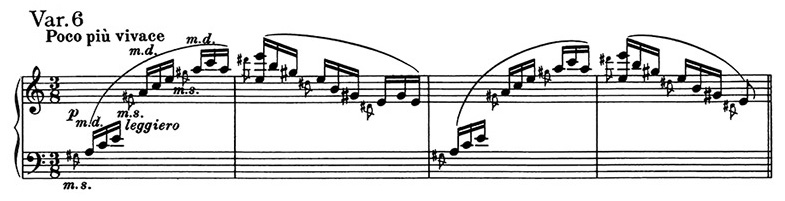 So wäre eigentlich alles klar und in bester Ordnung – wäre da nicht die 6. Variation im Heft 2… Hier das vollständige Notenbeispiel (die letzte Note ist schon der Auftakt zur 7. Variation):