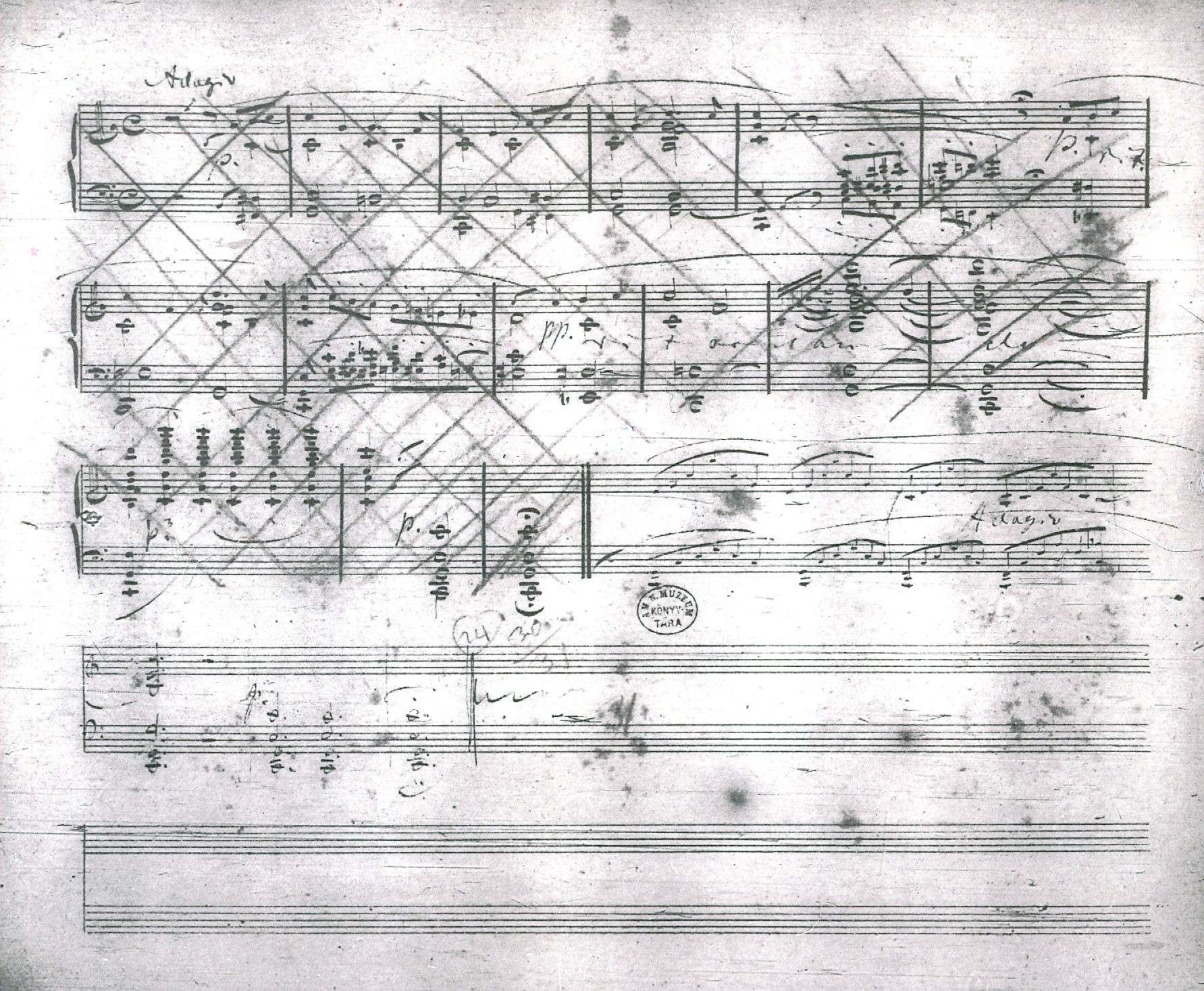 Was Sie hier sehen, ist die letzte Seite der C-dur-Fantasie op. 17 von Robert Schumann in der Handschrift des Kopisten Carl Brückner aus Leipzig. Die Quelle befindet sich in der Széchényi-Bibliothek in Budapest. Die ursprünglich notierten Takte (beginnend links oben mit „Adagio“), welche der Kopist aus dem (verlorenen) Autograph abgeschrieben hatte, strich Schumann selbst während seiner Überarbeitung und Druckvorbereitung des Werks eigenhändig durch. Im Anschluss schrieb er die endgültigen Schlusstakte, die man hier nur etwas schwächer erkennen kann. „End-gültig“ – denn so erscheinen sie dann auch in der gedruckten und von Schumann nachweislich Korrektur gelesenen Erstausgabe.