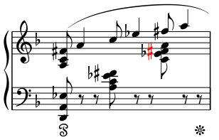 5) Mit zunehmender Auflösung des dur-moll-tonalen Systems ab dem Ende des 19. Jahrhunderts wuchs die Zahl der Vorzeichen und damit auch der Warnvorzeichen. Verständlicherweise sahen sich die Komponisten genötigt, zur Vermeidung von Missverständnissen bei harmonisch neuartigen Tönen und Klängen zusätzliche Zeichen zu notieren. Eine Stelle aus Maurice Ravels Sonatine (Satz III, Takt 140, HN 1018) mag dies demonstrieren.