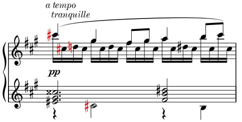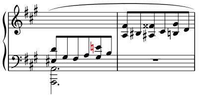 1) Beginnen wir mit einem ,klassischen‘ Fall: Der alterierte Ton fis¹ kehrt in einer anderen Stimme (hier sogar von anderer Hand ausgeführt) wieder, entnommen der Neuedition zu: Gabriel Fauré, Violinsonate Nr. 1 A-dur op. 13, Satz II, Takt 4 (HN 980).
