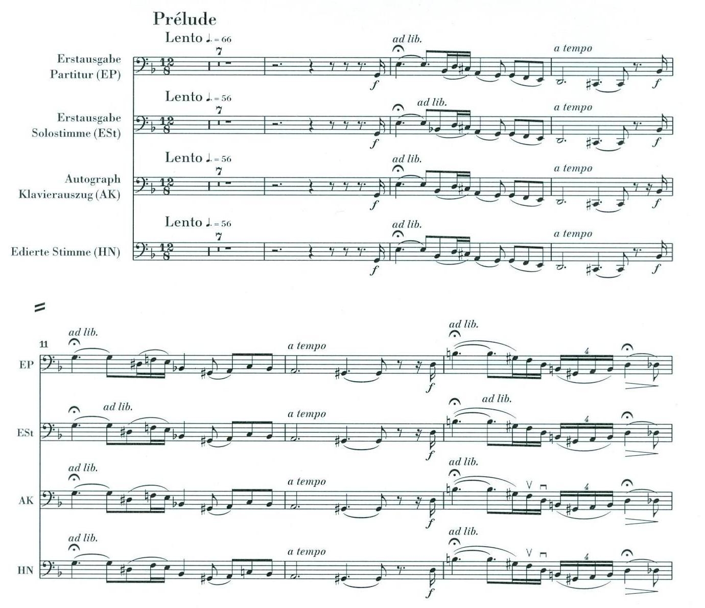 Einige der Korrekturen trug er allerdings zu einem Zeitpunkt ein, als der Druck bereits vorbereitet wurde. Komposition und Drucklegung überschneiden sich daher in der zeitlichen Abfolge, und die Abweichungen zwischen den verschiedenen Quellen sind zum Teil beträchtlich. Erschwert wird die Quellenbewertung dadurch, dass sowohl die Druckfahnen als auch die Stichvorlage zur gedruckten Partitur verschollen sind. Daher ist unklar, woher Varianten in der Druckpartitur stammen, die sich in keiner anderen Quelle bzw. in keiner der Korrekturschichten des autographen Klavierauszugs finden. Aufgrund der Lücken – sowohl in der Überlieferung der Quellen als auch in der Dokumentation der Chronologie von Komposition und Drucklegung – lässt daher sich eine Fassung letzter Hand nicht eindeutig rekonstruieren (vgl. die ausführlichen Darlegungen im Kritischen Bericht). Dies bedeutet in der Konsequenz, dass man sich der letztendlich vom Komponisten intendierten Gestalt der Solostimme nur annähern kann, umgekehrt dem Cellisten eine gewisse Freiheit zugestehen muss, vom edierten Notentext abzuweichen und Varianten aus anderen Quellen den Vorzug zu geben. Daher hat sich der Henle Verlag entschlossen, ergänzend zum Bemerkungsteil eine synoptische Übersicht als Download anzubieten, in der die Solostimme gemäß den Hauptquellen über der edierten Stimme erscheint.