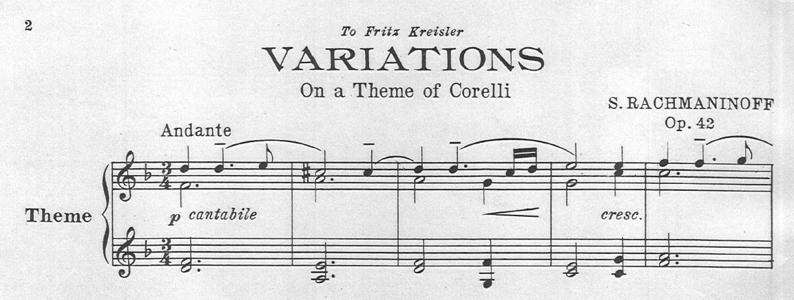 Vielleicht machte Fritz Kreisler – Rachmaninows Freund, Duo-Partner und Widmungsträger von Opus 42 – den Komponisten mit Corellis „Folia“-Komposition bekannt. In seiner Publikationsreihe Klassische Manuskripte für Violine und Klavier hatte Kreisler 1927 eine eigene Ausgabe der Variationen aus Corellis Opus 5 vorgelegt.