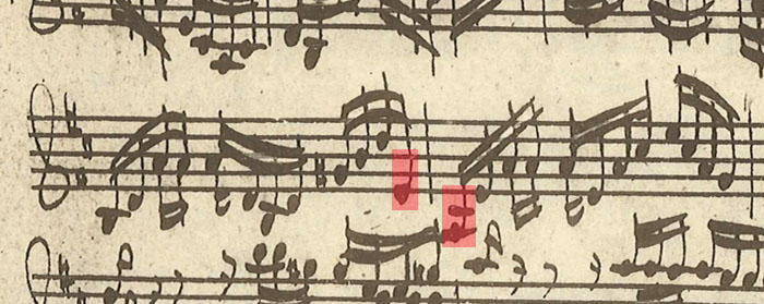 Busoni kannte zwar das Autograph zu diesem Zeitpunkt noch nicht, doch auch alle Druckausgaben der Bach’schen Chaconne, die ihm als Vorlage dienen konnten, haben e–a. Bei genauerer Betrachtung erscheint es unplausibel, hier ein Versehen Busonis – ein ausgezeichneter Kenner der Werke Bachs – anzunehmen. Denn es sind gleich zwei Noten abweichend, und dies in durchaus sinnvoller Weise, die eine kompositorische Absicht Busonis nahelegt: Während Bach mit dem kadenzierenden Quintfall zum Grundton des A-dur-Akkords eine harmonische Befestigung der unbegleiteten Solostimme vornimmt, stellt Busonis Stimmführung eine sogenannte Tenorklausel zur Durterz cis dar. Da in seiner Klavierfassung der Akkord-Grundton a bereits massiv im Bass erklingt, war für Busoni die klangliche Ausgewogenheit sicher wichtiger als übertriebene Werktreue. Probieren Sie es einmal am Klavier aus – das originale e–a würde in diesem Kontext merkwürdig „hohl“ klingen.