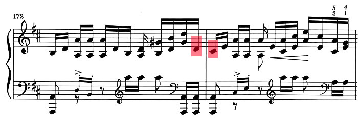 Ferruccio Busoni bettete die originale Violinstimme von J. S. Bachs Chaconne (aus der Partita für Violine d-moll BWV 1004) grundsätzlich unverändert in seine Klavierbearbeitung ein, wenngleich er bestimmte instrumentenspezifische Figuren wie Arpeggio-Passagen dem Klavier gemäß etwas freier adaptierte. Am Taktübergang 172/173 findet sich allerdings eine auffällige Abweichung in der Melodielinie (vgl. die rot markierten Noten in den Abbildungen): anstelle des originalen e–a steht bei Busoni d–cis: