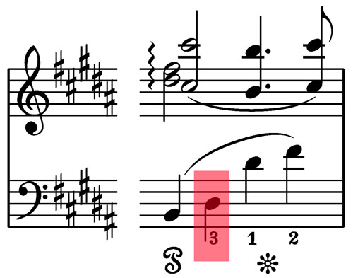 Im Gegensatz zum oben erwähnten Fall bei Busoni, wo die klangliche Verbesserung offensichtlich ist, scheint das dis hier eine unbefriedigende Variante: zwischen 2. und 3. Note entsteht ein großer Oktavsprung, zudem wird so die Terz des H-dur-Akkords wiederholt, was nach traditionellen Satzregeln unüblich ist. Doch so sehr es intuitiv reizen würde, diesen vermeintlichen „Terzverschreiber“ in ein fis zu verbessern – die philologischen Befunde sprechen eindeutig dagegen. Das Autograph ist leider nur unvollständig erhalten und kann für diesen Takt nicht weiterhelfen, aber alle anderen Quellen überliefern einhellig das dis.