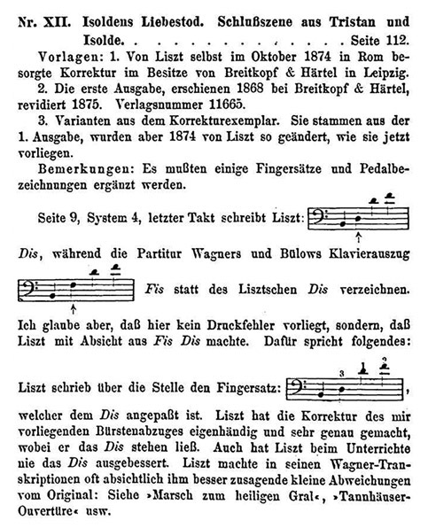 Auch der Pianist und Liszt-Schüler August Stradal, der Isoldens Liebestod im Rahmen der ersten Liszt-Gesamtausgabe herausgab, hat diese Note mit guten Gründen verteidigt (siehe Abbildung). Stradal gibt hier im Revisionsbericht die wichtige Information, dass Liszt auch beim Unterricht nie das fragliche dis verbessert habe, und verweist auf die häufigen kleinen Abweichungen, die Liszt sich in seinen Transkriptionen gestattete. Und noch ein weiteres gutes Argument führt Stradal an: Liszts originalen Fingersatz 3–1–2, der ideal zum dis passt.