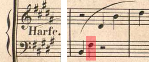 Wesentlich umstrittener und von Pianisten bis heute diskutiert ist dagegen eine auffällige Divergenz in Isoldens Liebestod, d.h. Franz Liszts Klaviertranskription der Schlussszene aus Richard Wagners Tristan und Isolde. Stein des Anstoßes ist die 2. Bassnote in Takt 78, die Liszt als dis notiert, wohingegen in Wagners Partitur bei dieser Akkordbrechung in der Harfenstimme ein fis steht (siehe Notenbeispiele).