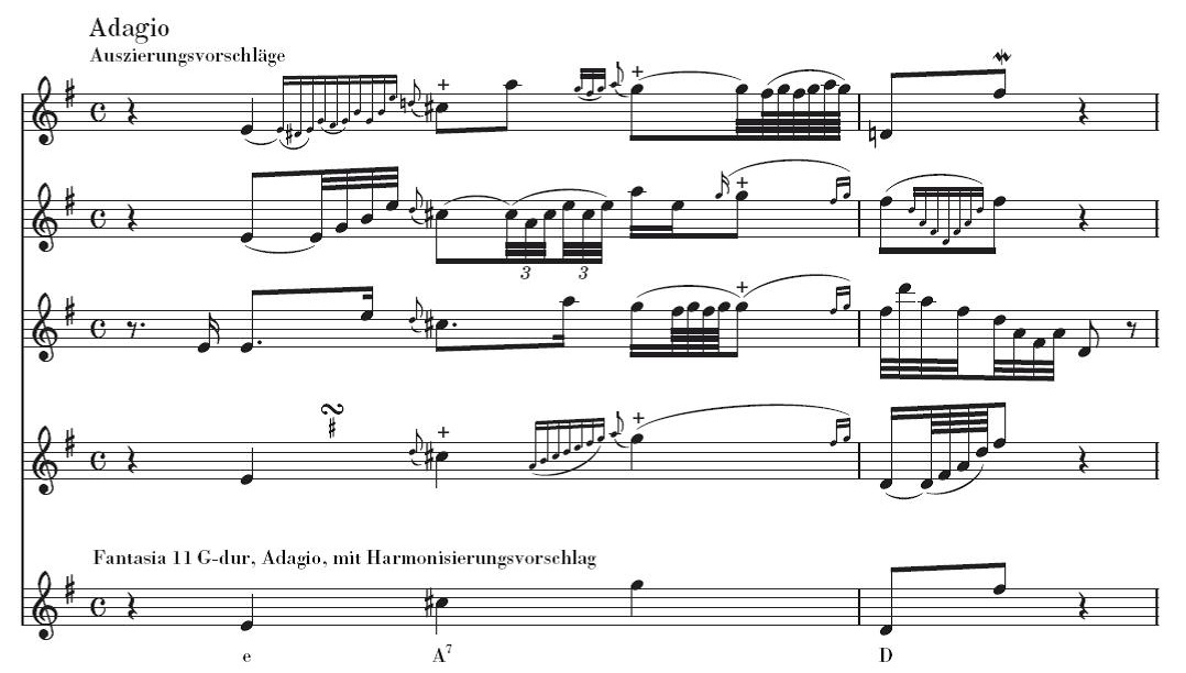 Als ein Beispiel sei hier ein melodisches Fragment aus der 11. Fantasie Telemanns angeführt (unterste Zeile) mit möglichen Auszierungsvorschlägen von Rachel Brown darüber.