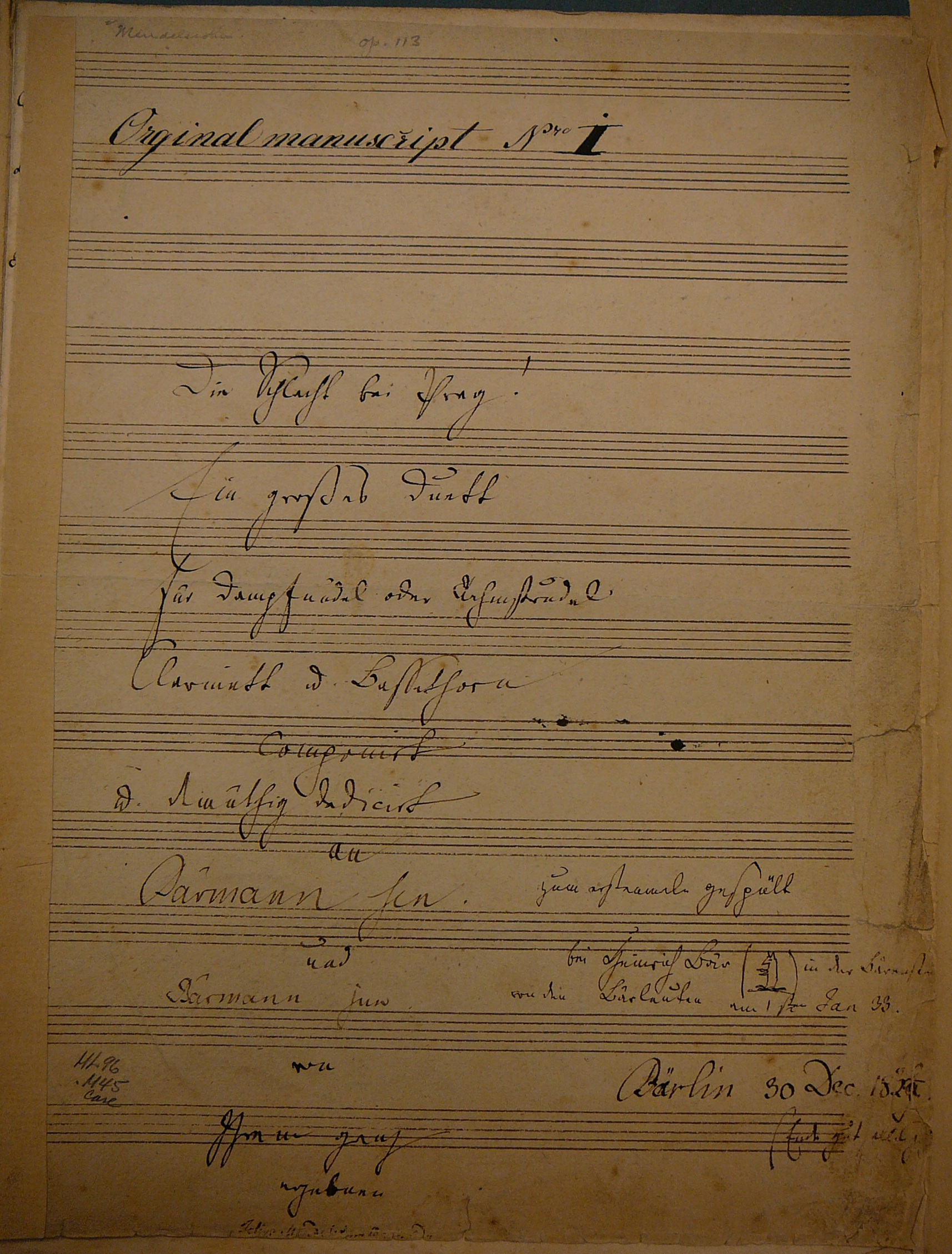 So lustig die Entstehungsgeschichte auch sein mag, fehlt es nicht an Schwierigkeiten für die Edition. Dies gilt in besonderer Weise für das erste der beiden Konzertstücke, das wie geschildert an einem einzigen Tag entstanden ist. Dementsprechend ist das Originalmanuskript Mendelssohns sehr flüchtig geschrieben und mit zahlreichen Korrekturen versehen. Auf dem Titelblatt wird die Komposition von Mendelssohn als „Schlacht bei Prag“ und „Großes Duett für Dampfnudel oder Rahmstrudel“ bezeichnet, wobei der Haupttitel möglicherweise auf die historische Schlacht bei Prag im Mai 1757 zwischen Preußen und Österreich anspielt – also preußische Komposition gegen (bayerisch-)österreichische Küche. Mendelssohns Humor macht aber auch nicht vor dem Namen der Widmungsträger halt: Das „Bär“ in „Baermann“ wird zu zahlreichen Wortspielereien (wie „Bärlin“ statt „Berlin“) genutzt, die mit einer eigenhändigen Zeichnung eines Bären gekrönt werden.