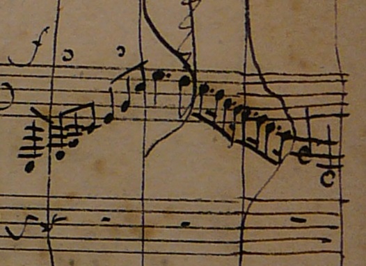 Der Herausgeber des Bandes, Julius Rietz, nutzte offenbar zu dieser Edition eine ebenfalls erhaltene eigenhändige Abschrift, wo sich genau derselbe Notentext findet. Welche Vorlage aber hatte er dazu? Und wie kommt es zur Änderung von einer Halbenote zu zwei Viertelnoten?