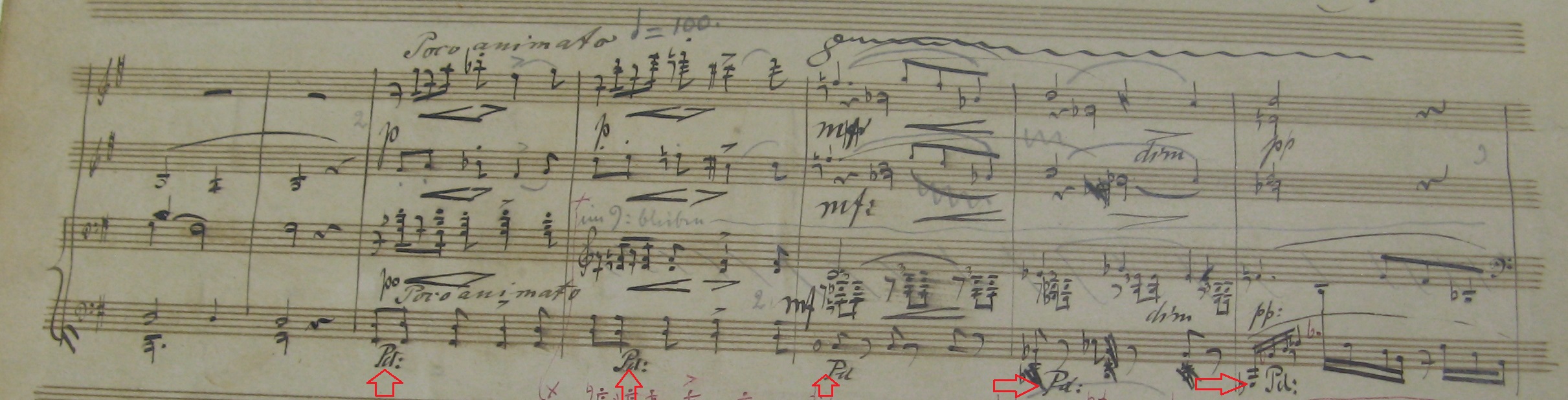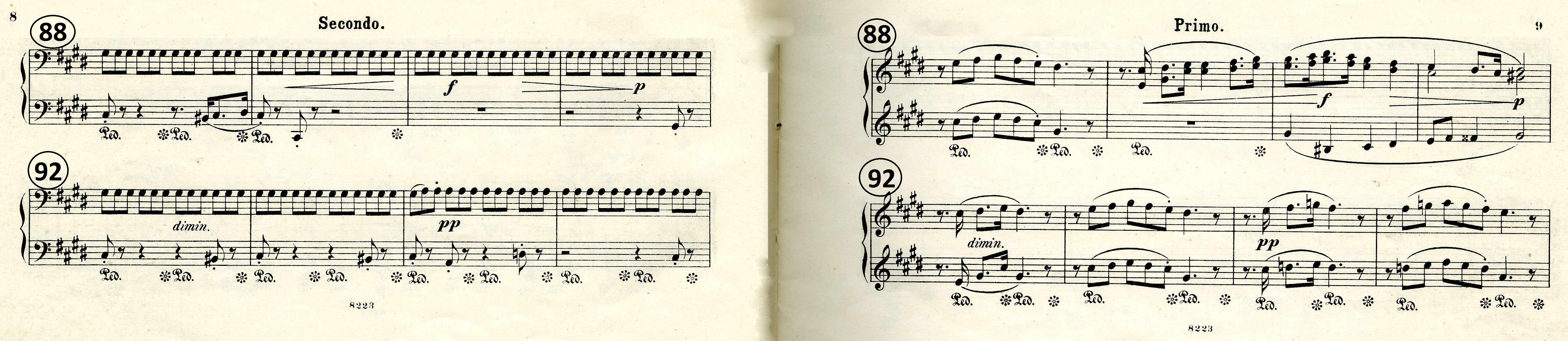 Abweichend davon finden sich in der Erstausgabe überraschenderweise Pedalbezeichnungen sowohl in der Secondo- als auch in der Primo-Stimme.