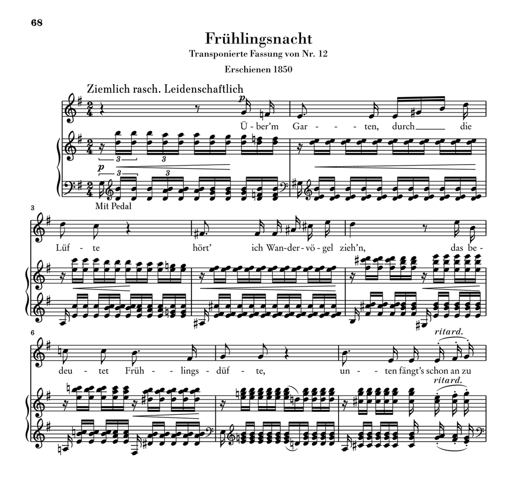 Der historisch informierte Leser mag nun einwenden, dass solche Auflösung der Zyklen doch kein Problem ist, da diese ja auch zu Schumanns Zeiten keineswegs vollständig erklangen, sondern öffentlich nur einzelne Lieder vorgetragen wurden. Zudem hat Schumann selbst gerne mal dieses oder jenes Lied aus einem Zyklus in anderem Zusammenhang abgeschrieben oder veröffentlicht und dabei sogar transponiert – wie zum Beispiel die „Frühlingsnacht“ aus Opus 39 in das pianistisch einfacher zu bewältigende G-dur (vgl. die Wiedergabe beider Fassungen in unserer Urtext-Ausgabe HN 550).