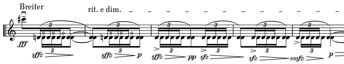 Eine besonders kreative Neuschöpfung gelang Alban Berg in seinem Streichquartett op. 3 aus dem Jahre 1910 (siehe unsere brandneue Urtext-Ausgabe, die ab November erhältlich sein wird ). In der Violine II findet sich im 2. Satz eine Folge von raschen Tonrepetitionen, deren Anfang jeweils betont werden soll, jedoch nach und nach schwächer. Nach sforzatissimo (sffz) und sforzato (sfz) gelangt Berg eigentlich ganz folgerichtig zu einem „mezzo-sforzato“, das er mit smfz abkürzt: