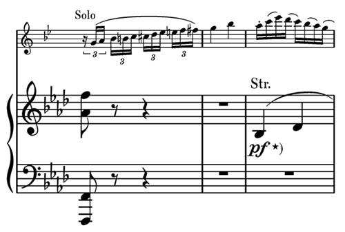 Es liegt nahe, die Dynamik als poco mezzoforte zu lesen. In der Erstausgabe finden sich hier interessanterweise zwei divergierende Angaben für die Violine: In der Partitur steht mf, in der Einzelstimme p. Vielleicht wussten die Notenstecher nichts mit Dvořáks ungewöhnlicher Vorschrift anzufangen…?
