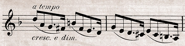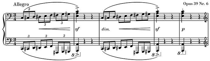 So verwendet Sergej Rachmaninow in seiner Étude-Tableau op. 39 Nr. 6 eine ungewöhnliche Kombination aus dim. und Crescendo-Gabel in Takt 3: