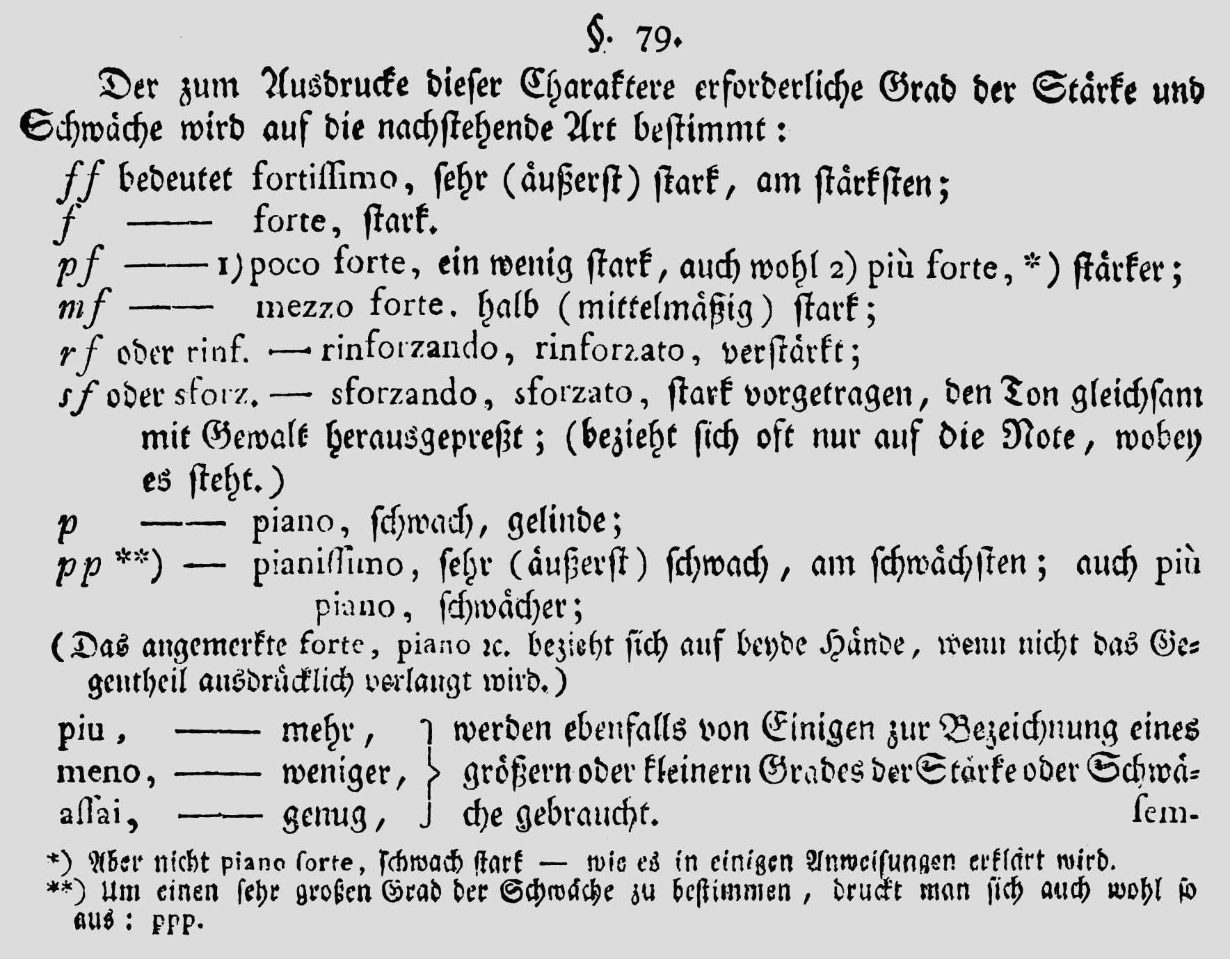 Tatsächlich ist das pf aber keine Erfindung Brahms’, sondern bereits seit dem 18. Jahrhundert belegt. So erklärt Daniel Gottlob Türk 1789 in seiner Klavierschule das pf als „1) poco forte, ein wenig stark, auch wohl 2) più forte, stärker“ und weist eigens darauf hin, dass „nicht piano forte, schwach stark“ gemeint sei.