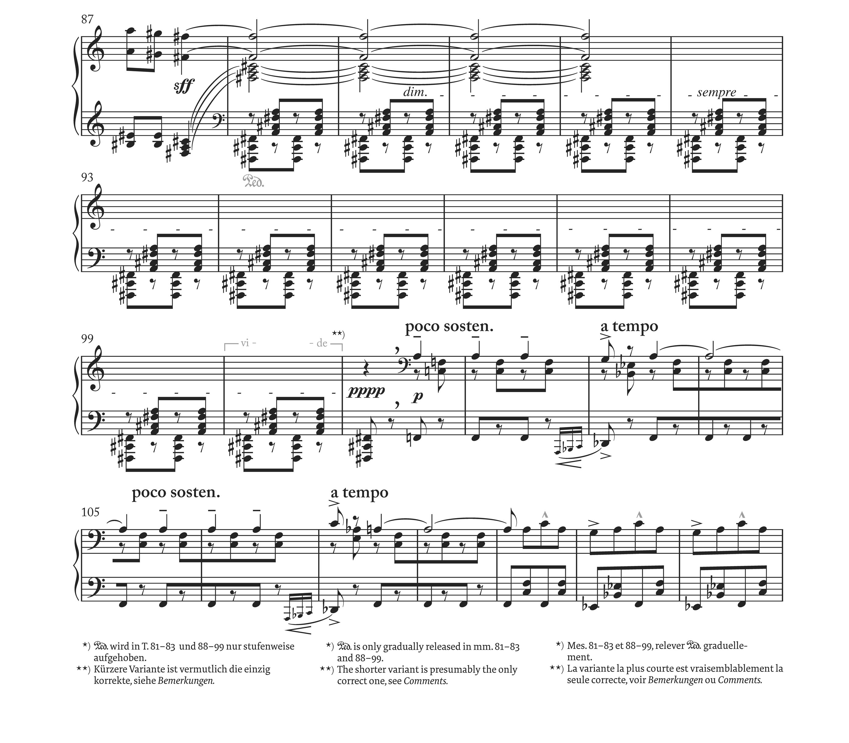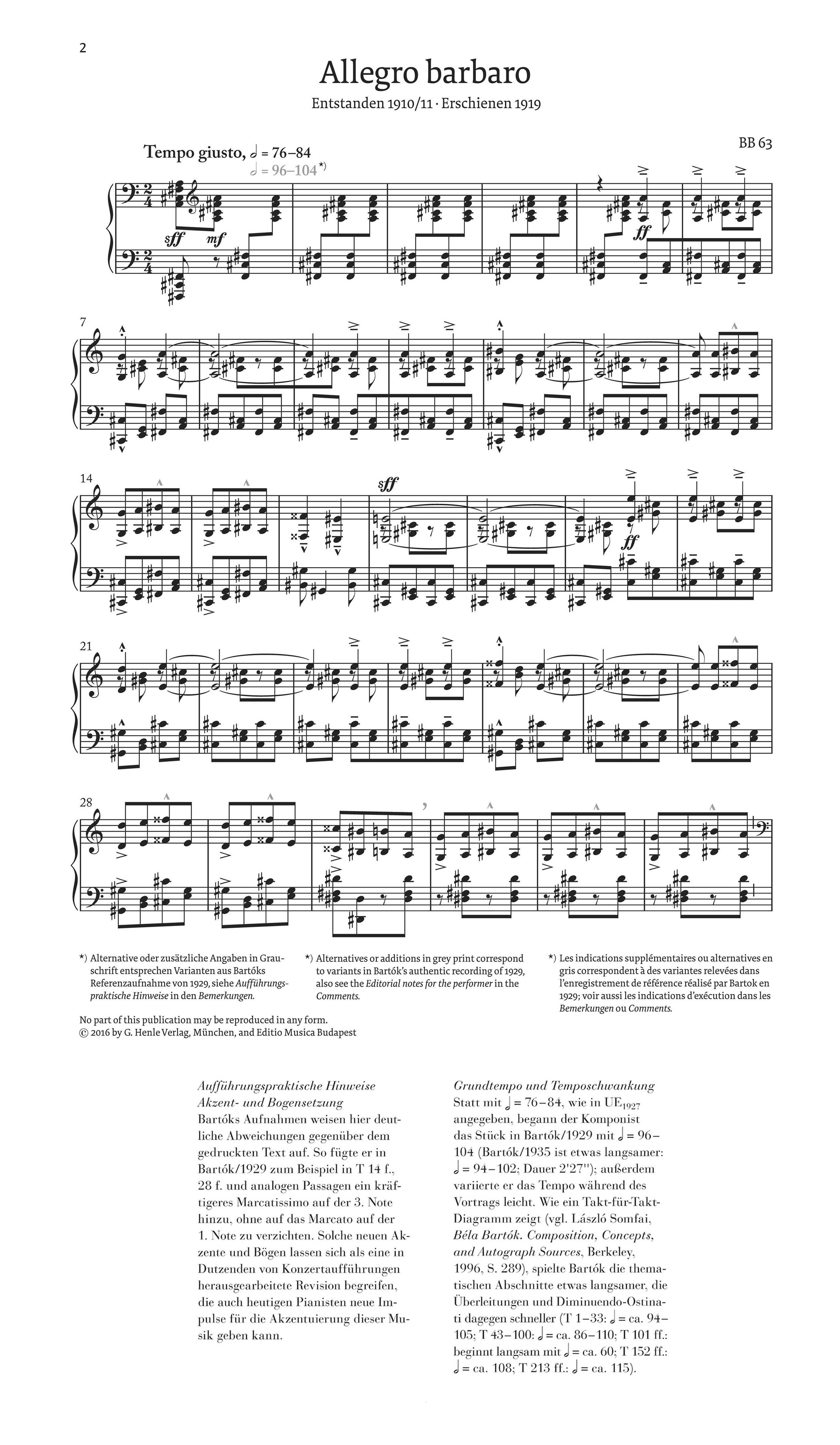 Ganz spontan: Ich bin dem Verlag sehr dankbar für die Idee, die Ausgabe des Allegro barbaro zusätzlich mit Varianten in Graudruck zu versehen – die perfekte Lösung für eine empfohlene, aber nicht verpflichtende authentische Anweisung. Ich hoffe, dass die Musiker, die das Stück aus dem neuen Henle-Urtext spielen, sich auch genau Bartóks Aufnahmen anhören. Nach meiner Erfahrung haben selbst Bartók-Experten unter den Pianisten, die ansonsten viele wichtige Merkmale aus der Einspielung des Komponisten übernehmen, bisher davon abgesehen, die abweichenden Ostinato-Wiederholungen zu spielen, obwohl sie sie aus der Aufnahme kennen. Die Urtext-Ausgabe stellt durch den Graudruck im Notentext und die Erläuterungen dazu klar, dass diese „korrigierte“ Länge einer Revision durch den Komponisten entspringt.
