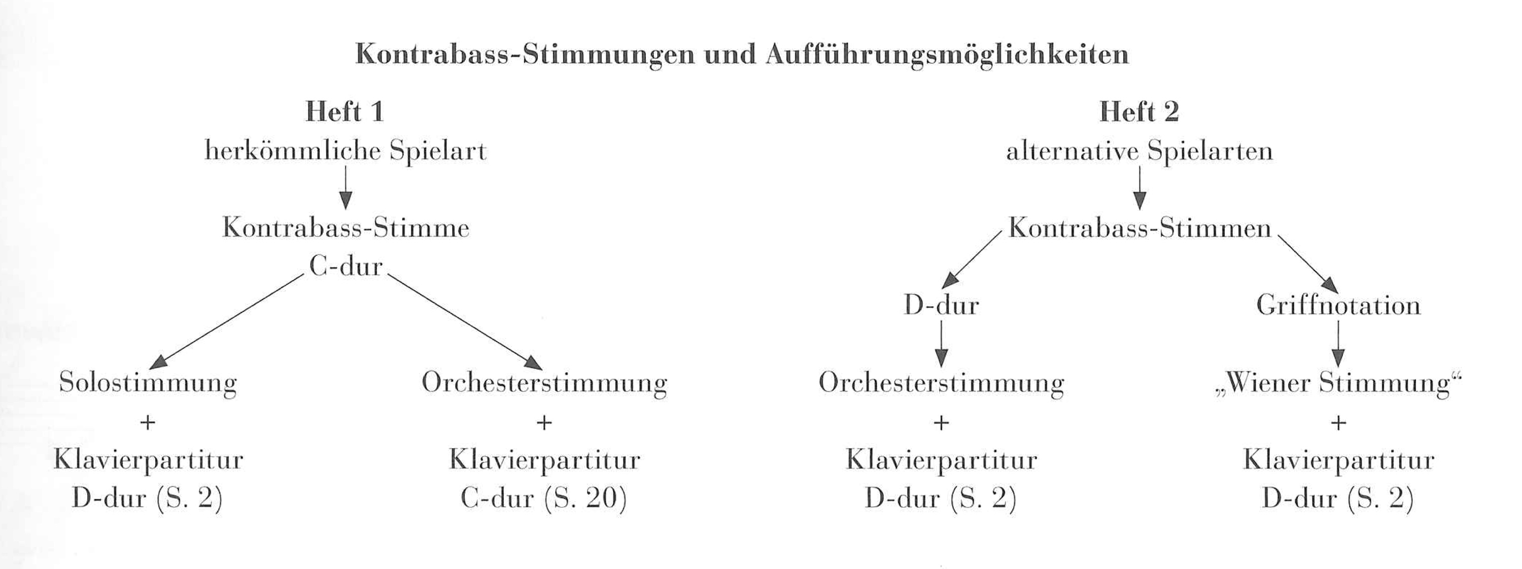 Um all dies zu berücksichtigen, liegen der Edition zwei separate Stimmenhefte für Kontrabass bei: In Heft 1 ist die am häufigsten gespielte Version in C-dur abgedruckt; Heft 2 widmet sich der Spielart in D-dur sowie der historischen „Wiener Stimmung“ (A-d-fis-a). Letztere wird durch die abgedruckte, leicht verständliche Griffnotation sofort und ohne langwieriges Umlernen spielbar. Für Spezialisten mit Erfahrung in „Wiener Stimmung“ ist überdies eine Urtext-Stimme ohne Griffnotation auf der Henle-Website herunterladbar.