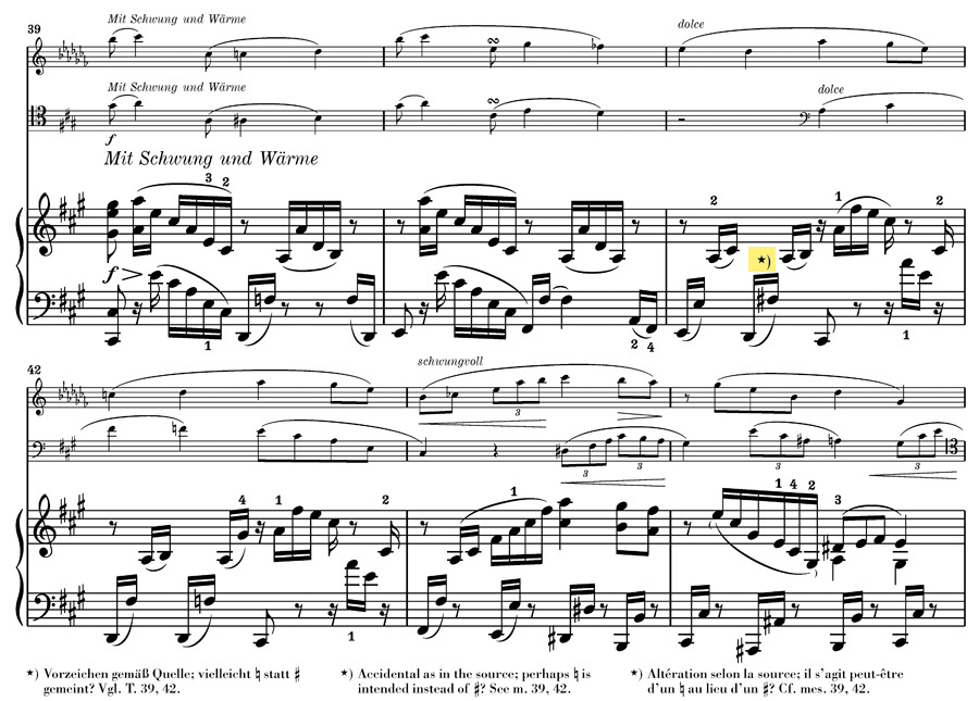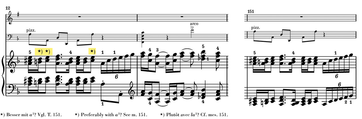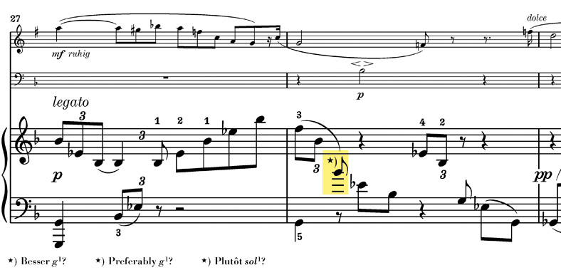 Die fehlenden oder falschen Vorzeichen lassen sich in der Regel aus dem musikalischen Kontext relativ zweifelsfrei ermitteln. Andere Stellen sind dagegen weniger eindeutig, vor allem die von Beaumont erwähnten „inconsistencies“ zwischen Parallelstellen oder zwischen Partitur und den Einzelstimmen. Drei Beispiele hierfür, alle aus der Klavierstimme, 1. Satz (zum Vergrößern anklicken):