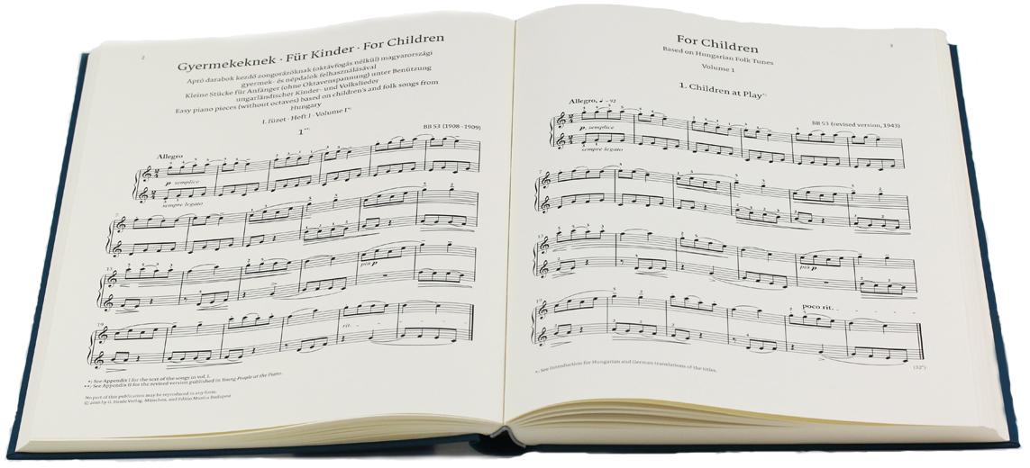 Ebenfalls höchst interessant ist der Umstand, dass Für Kinder in zwei Fassungen existiert, von denen die eine zu Beginn von Bartóks kompositorischer Laufbahn (1908–1911), die andere hingegen in seinen letzten Lebensjahren (1943) entstand. Zum direkten Vergleich präsentieren wir diese zwei Fassungen ausnahmsweise synoptisch. Die Unterschiede betreffen manchmal nur kleine (aber wichtige) harmonische Nuancen, mitunter auch spezifische Notationsfragen. Bartók änderte nämlich um 1908 seine Notationsgewohnheiten auf Grund von avantgardistischen Ideen geradezu revolutionär. So verzichtete er wegen der freien Behandlung der Tonalität einige Jahre grundsätzlich auf Generalvorzeichnungen, die er später dann bei der Revision dieser Stücke doch einführte – wenn auch manchmal etwas ungewöhnlich unter minutiöser Berücksichtigung der modalen Tonleiter der Melodien.