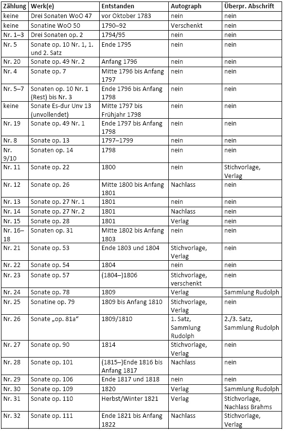 In dieser Tabelle sind alle überlieferten Sonaten und Sonatinen für Klavier von Beethoven in der Reihenfolge ihres Entstehens aufgeführt.