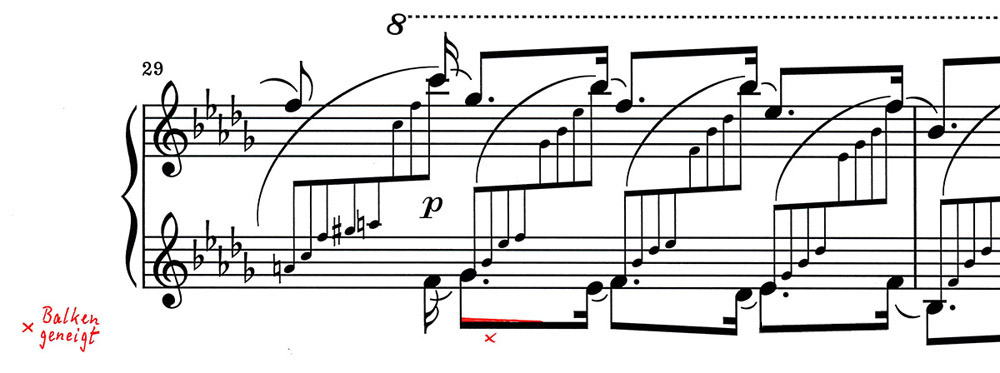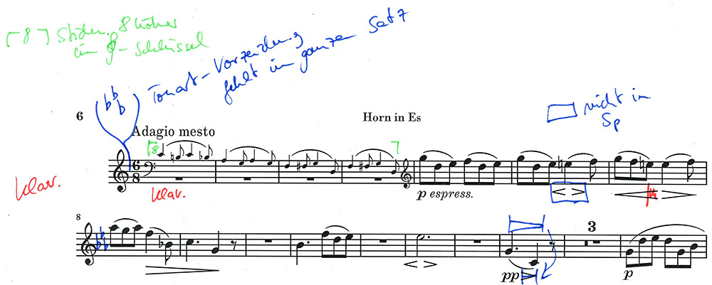 Wenn die Ausgabe zusätzlich Einzelstimmen enthält, werden diese erst anschließend aus der korrigierten Partitur herausgezogen und dann noch weitere drei Male (mindestens) zur Korrekturlesung gegeben. Denn so bequem der Stimmenauszug mit dem Computer heute ist – bei diesem Schritt können noch viele neue Fehler oder Mängel entstehen: falsche Transpositionen, verlorengegangene oder verrutschte Zeichen, fehlerhafte Stichnoten, schlechte Wendestellen u.v.m., wie in diesem Beispiel: