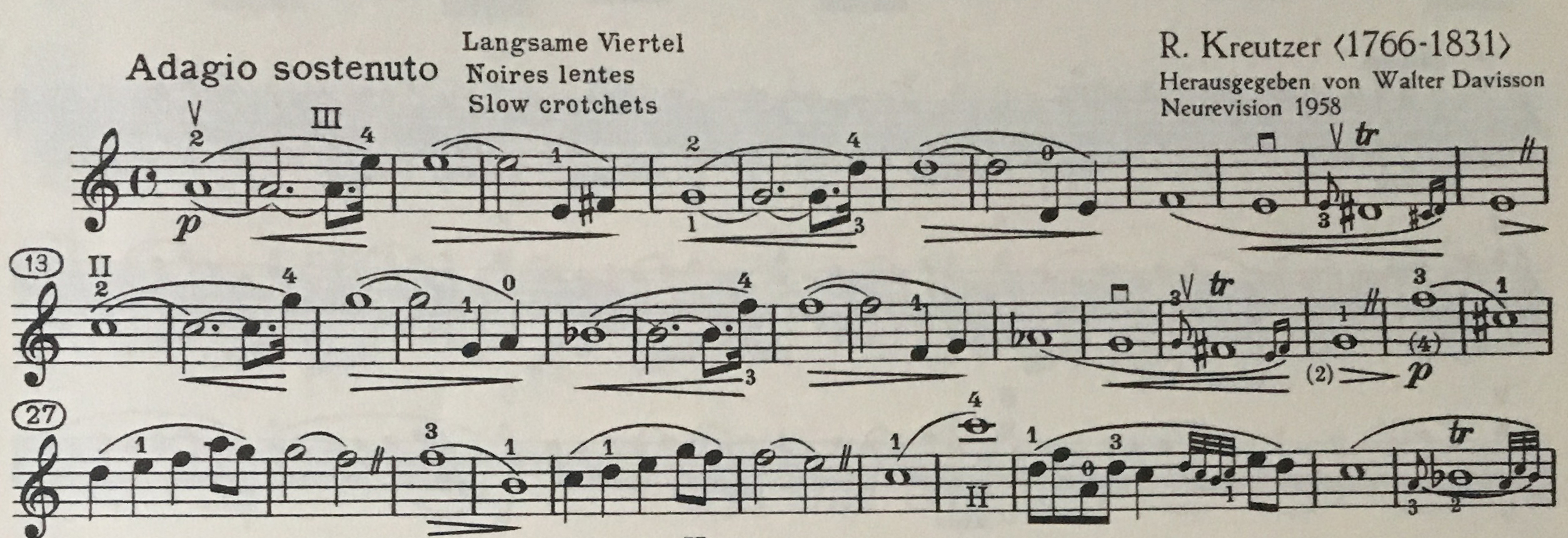 Moment, immer noch nur 40 Etüden? Ja, denn Kreutzer entfernte in dieser Sammlung, „revue et corrigée par l’Auteur“, die Stücke Nr. 1 und Nr. 12 und ergänzte die in der Erstausgabe nicht vorhandenen Nr. 13(/14) und Nr. 25.