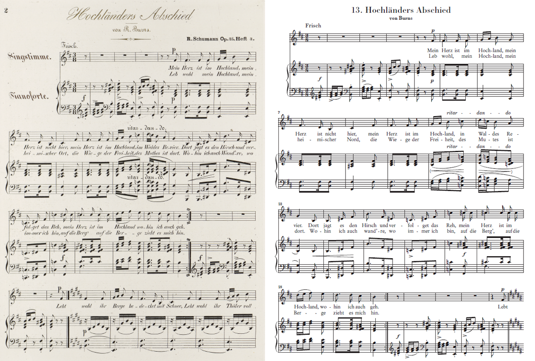 Denn eine moderne Urtextausgabe bietet eben nicht nur einen nach aktuellem Forschungsstand gesicherten Notentext, sondern sie präsentiert diesen auch in einer zeitgemäßen, normierten Darstellung. Schumanns Liederalben bieten dafür ein besonders gutes Beispiel, denn hier kommt zum reinen Notensatz auch Gesangstext hinzu. Der Vergleich der 1840 bei Kistner in Leipzig erschienenen Erstausgabe mit unserer brandneuen Urtextausgabe von Schumanns Myrthen op. 25 macht die Unterschiede unmittelbar deutlich: