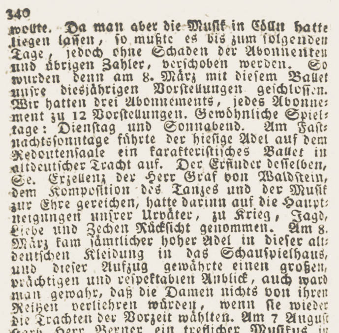 Am Fastnachtssonntage führte der hiesige Adel auf dem Redoutensaale ein karakteristisches Ballet in altdeutscher Tracht auf. Der Erfinder desselben, Se. Exzellenz der Herr Graf von Waldstein, dem Komposition des Tanzes und der Musik zur Ehre gereichen, hatte darinn auf die Hauptneigungen unsrer Urväter, zu Krieg, Jagd, Liebe und Zechen Rücksicht genommen. Am 8. März [d.h. am Fastnachtsdienstag] kam sämtlicher hoher Adel in dieser altdeutschen Kleidung in das Schauspielhaus, und dieser Aufzug gewährte einen großen, prächtigen und respektablen Anblick, auch ward man gewahr, daß die Damen nichts von ihren Reitzen verliehren würden, wenn sie wieder die Trachten der Vorzeit wählten.