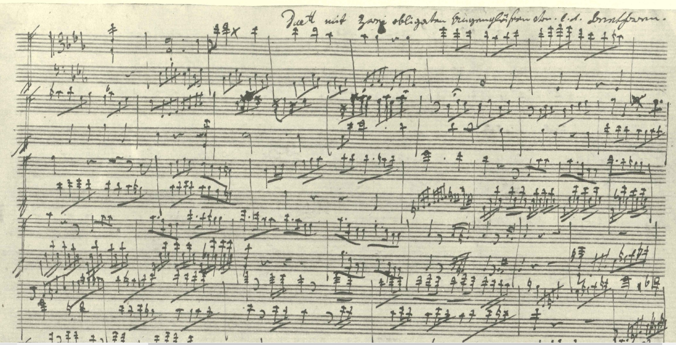 Anders als beim übertragenen Notturno op. 42 gibt es beim „Duett mit zwei obligaten Augengläsern von l. v. Beethoven“ für Viola und Cello – wie es auf der oben abgebildeten Seite heißt – keinen Zweifel an der Echtheit des Werks. Und dennoch ist die Quellenlage, wie schon bei Opus 42, unbefriedigend, wenn auch aus anderem Grund: Es liegt kein vollständiges Autograph des offensichtlich mehrsätzig geplanten Duos vor. Lediglich der 1. Satz und das „Minuetto“ samt „trio“ finden sich im sogenannten Kafka-Skizzenkonvolut, einer Sammlung von losen Blättern aus Beethovens früher Zeit.