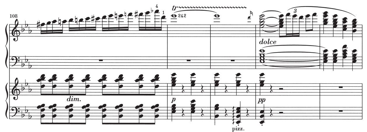 Hier jedoch, in Takt 268, hat Beethoven plötzlich das Thema gleichsam verloren, und wir haben für zwei Takte nur noch bloße Umspielungen der Harmonie, ein Muster, das sich durch Modulationen in fremde Tonarten hindurch wiederholt. Es ist ein unglaublicher Moment – wir hören eine Ahnung dessen, was hinter der „Fassade“ des Hauptthemas steckt.