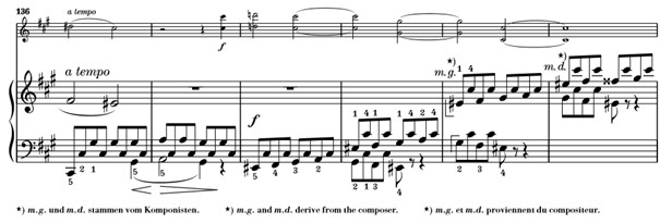 PJ: In Faurés 1. Violinsonate (HN 980) gehen Sie im Kopfsatz noch einen Schritt weiter und heben die vom Komponisten mittels m. g. explizit angegebene Verteilung der Hände (Takt 140) auf: