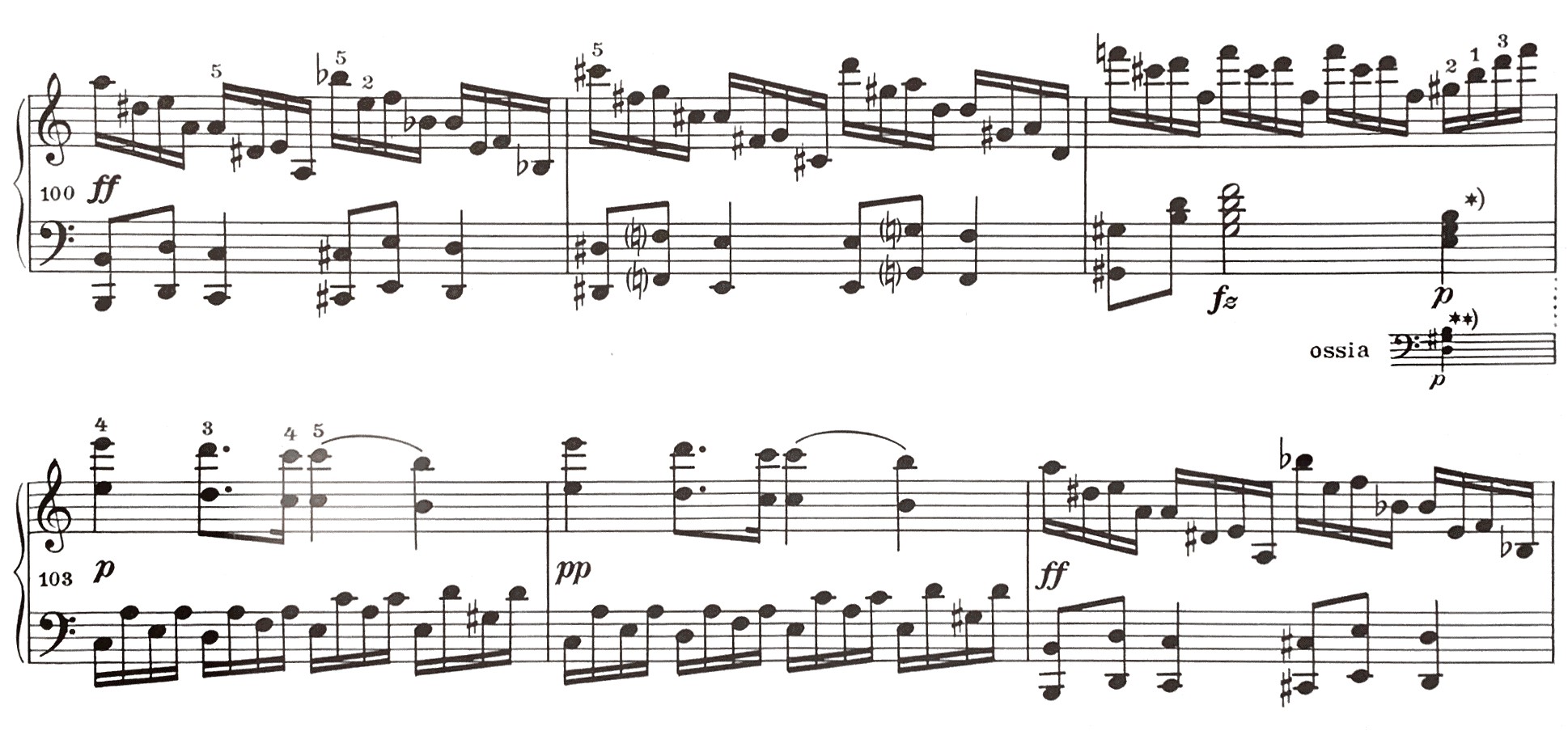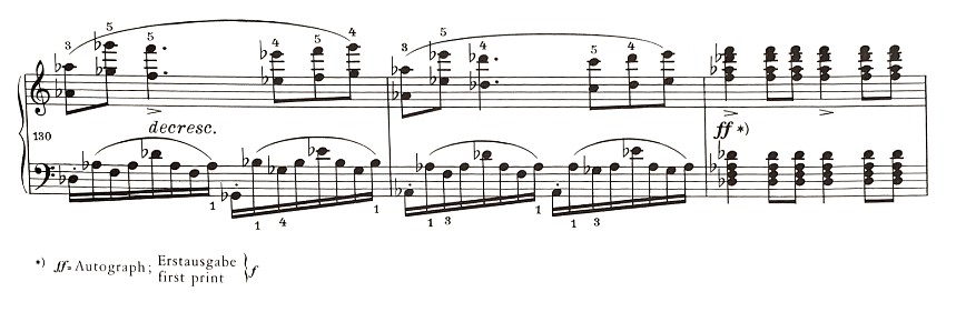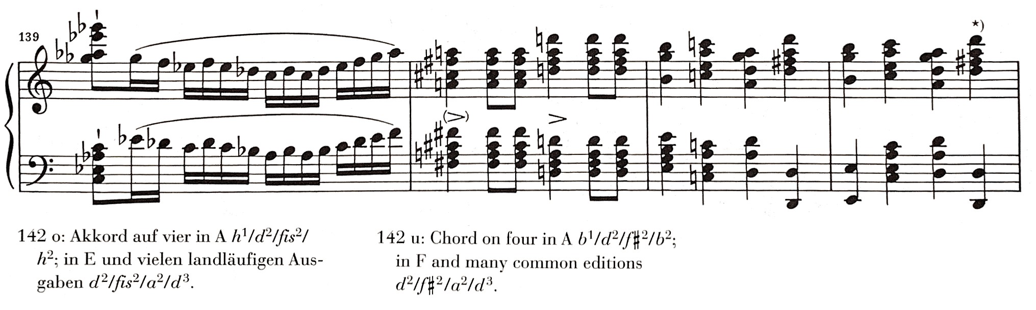 Ernst Herttrich, der Herausgeber unserer Urtextausgabe, der laut seinem kurzen Vorwort das Autograph zur „Hauptquelle“ machte und die Erstausgabe „nur in Zweifelsfällen zu Rate“ zog, ging offensichtlich zu radikal vor. Zwar vermeidet er sehr strikt eine Quellenvermischung im Notentext und richtet sich streng nach dem Text des Autographs – womit er meines Erachtens die Quellenbewertung auf den Kopf stellte –, aber er geht nur in einer einzigen Fußnote auf die augenfälligen Änderungen im Erstdruck ein (T. 142). Gleichwohl bietet er immerhin in den Bemerkungen am Ende der Ausgabe für die Studierwilligen unter den Pianisten eine Liste der auffälligen Abweichungen im Druck, ohne diese weiter zu bewerten.