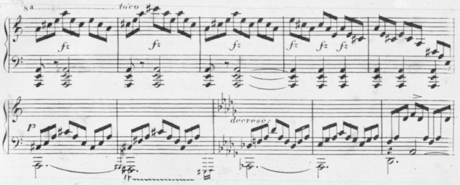 Fast unbemerkt führt uns Schubert hier aus der zuvor vielfach gefestigten Grundtonart Des-dur in eine erregte, vorzeichenlose Fläche, in der dann über sieben Takte nichts weiter als ein A-dur-(!) Dreiklang auf- und abwogt. A-dur in Des-dur? – nicht gerade freundlich benachbarte Tonarten 😉 Wie aber wieder zurück nach Des-dur gelangen?