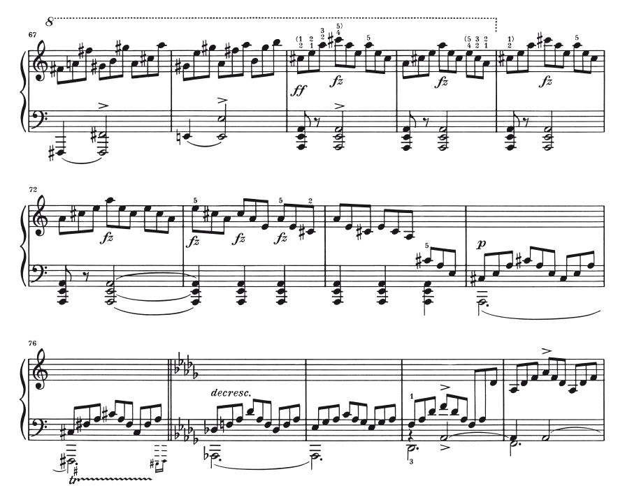 Besonders raffiniert scheint mir dabei der Triller im Bass auf dem sehr tiefen Fis (Bassgang: A1 – Fis1 – As1 – Des). Dieser Triller über dem aus A-dur ableitenden Fis „moderiert“ gewissermaßen den wunderbaren Harmonik-Wechsel; durch sein tiefes Murmeln wird außerdem für einen Moment unsere Aufmerksamkeit auf das eigentliche „atemraubende“ Geschehen ein wenig abgelenkt.