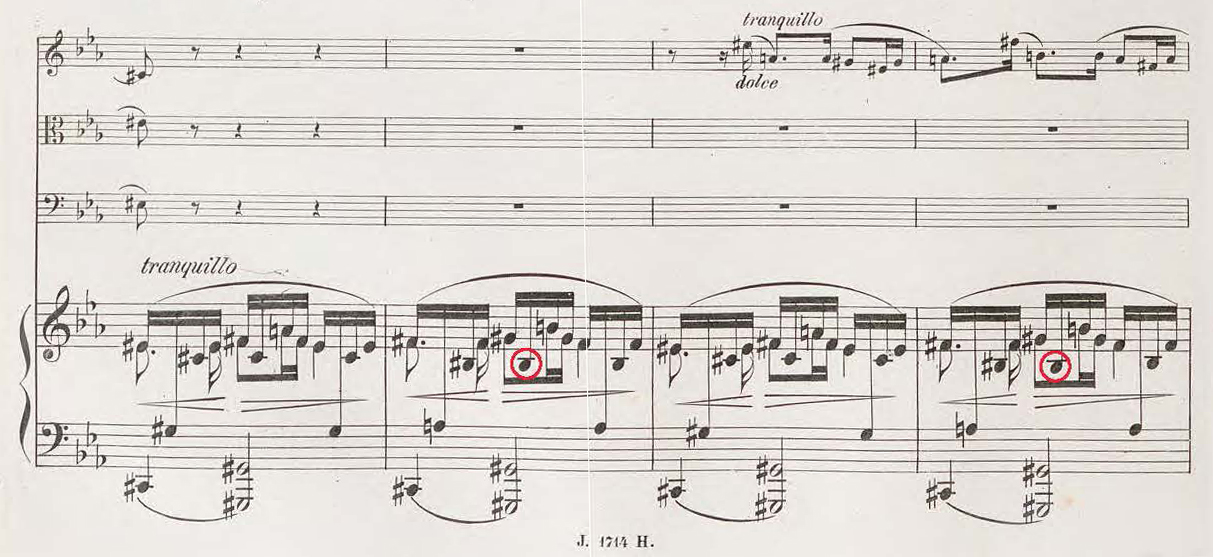 2) Im 3. Satz, Takt 34 liegt im Klavierbass ein ähnlicher Querstand h/b/h vor:
