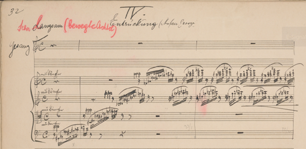 Beginn des 4. Satzes „Entrückung“ in der autographen Partitur (Washington, Library of Congress); endgültige Tempoangabe: Sehr langsam (gehende Achtel)