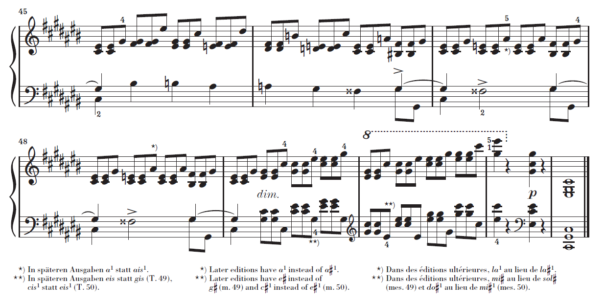 Aus Sicht unserer Herausgeberin Valentina Rubcova haben die meisten dieser späteren, nicht autorisierten Varianten nichts mit Skrjabin zu tun. Viele der Korrekturen sind jedoch ins Bewusstsein moderner Pianistinnen und Pianisten gedrungen. Um für all jene, die hier und da einen anderen Notentext gewohnt sind, soviel Transparenz wie möglich zu schaffen, führt unsere Ausgabe die wichtigsten dieser Lesarten in Fußnoten mit. Damit kann sich jede und jeder selbst ein Bild machen und im Zweifelsfall entscheiden, welcher Variante sie oder er den Vorzug geben will. Zur Illustration hier der Schluss der Etüde I. In T. 47–50 bringen spätere Ausgaben abweichende Lesarten, die „glatter“, systematischer und logischer wirken. Aber sind sie nicht gerade schon deswegen verdächtig?