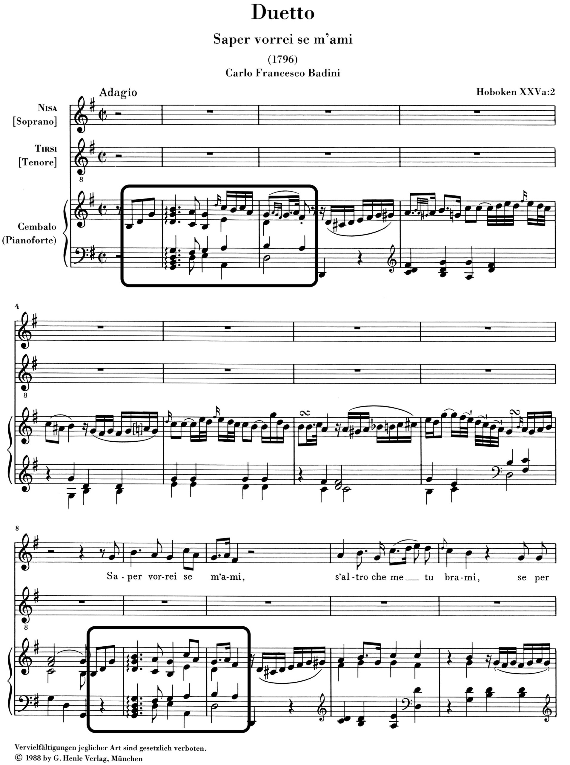 Der Radio-Sprecher löste das zweite Rätsel: Es handelte sich um Joseph Haydns Duetto „Saper vorrei se m’ami“ Hob. XXVa:2. Hören Sie sich es hier an – und stimmen Sie mir zu: Dieses Liebesduett ist doch einfach wunderschön! Schnell war es im Henle-Katalog ausfindig gemacht. Wir bieten „Saper vorrei“ zusammen mit einem weiteren Haydn-Duett als schmale Urtextedition an, dessen Notentext der Haydn-Gesamtausgabe (Reihe XXIX, Band 2) entnommen ist.