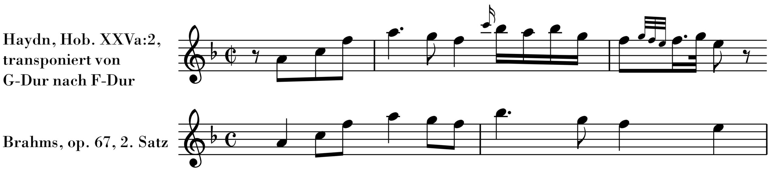 Bliebe nur noch die (vielleicht letztlich unwichtige?) Frage, ob Brahms hier bewusst oder unbewusst tatsächlich Haydn „zitiert“ oder ob diese Melodie sozusagen „auf der Straße liegt“, also vielleicht doch völlig unabhängig voneinander von Haydn und Brahms verwendet wurde. Dafür spricht vielleicht das oben genannte Dvořák-Beispiel. Denn es zeigt ja ebenfalls dieselbe Notenfolge wie bei Haydn und bei Brahms. Ich bleibe aus Erfahrung skeptisch, denn bei Dvořák geht es in munteren gleichmäßig-glatten Achtelnoten dahin, während Brahms und Haydn hingegen (nahezu identisch) rhythmisieren und damit aus der bloßen Notenfolge recht eigentlich erst eine „Melodie“ machen. Abgesehen davon, konnte Brahms die Dvořák-„Melodie” aus Chronologie-Gründen gar nicht gekannt haben.