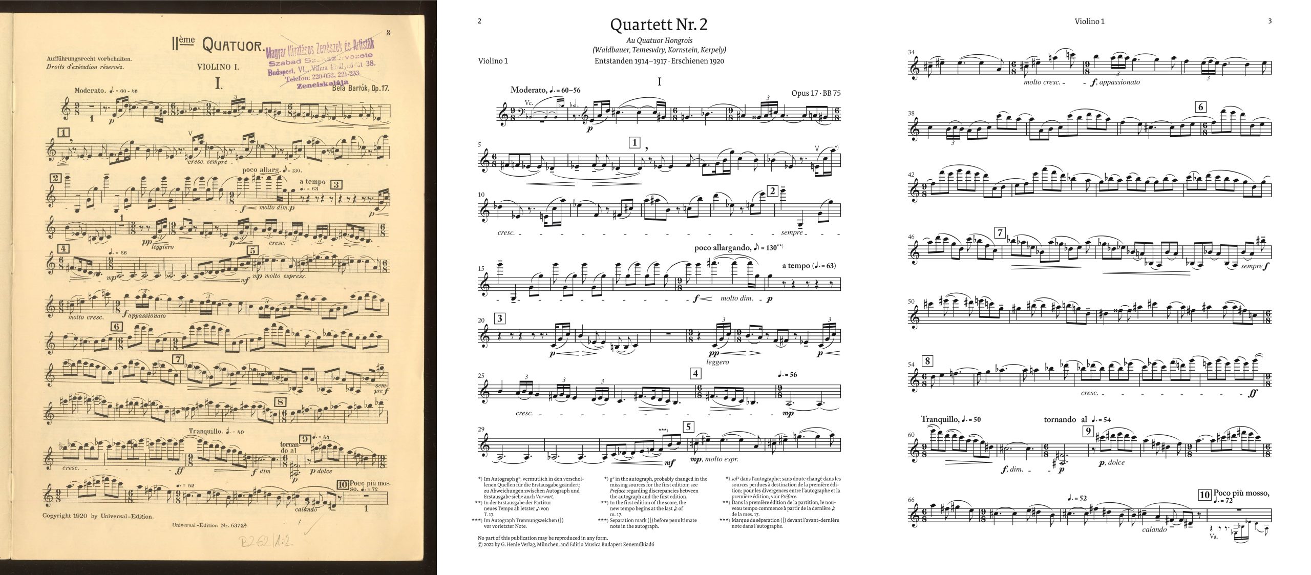 Klingt alles sehr theoretisch? Na, dann schauen wir uns den Prozess doch mal ganz praxisnah an am Beispiel unserer gerade erschienenen Stimmen-Ausgabe von Bartóks Streichquartett Nr. 2. Wie bei vielen Werken des 20. Jahrhunderts zeigt bereits ein Blick in die Partitur, wie unterschiedlich dicht das Notenbild eines Quartetts aus dem 18. Jahrhundert gegenüber dem eines Quartetts aus dem 20. Jahrhundert aussieht: